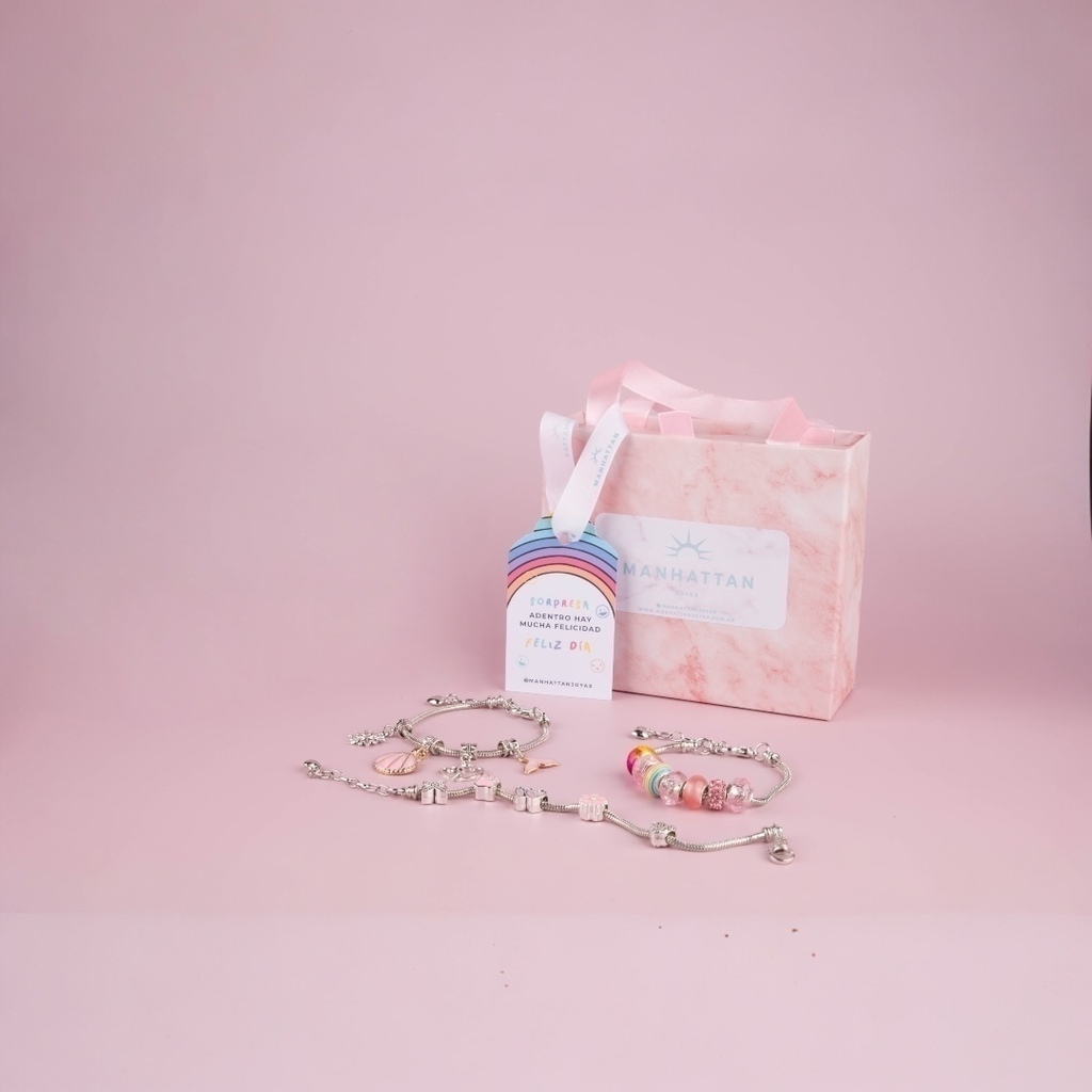 viene presentada en una hermosa caja de carton rigido, los dijes vienen en sobres de eco cuero para que puedas guardarlos y la envolvemos con el mas lindo packaging para que tu regalo sea hermoso y unico